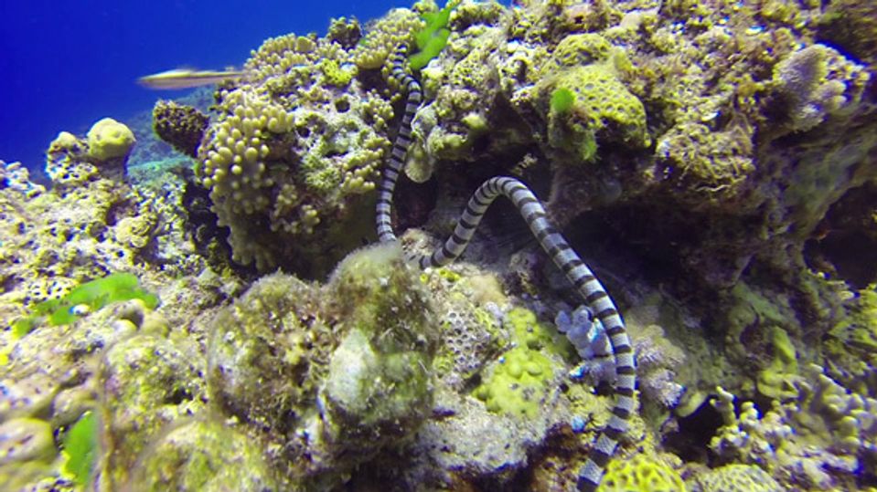 Odborne nazývaný ploskochvost užovkový. Mimoriadne jedovatý a zákerný. Rozmnožuje sa na súši, je však výborný plavec. Má typické sfarbenie - bielu dopĺňajú tmavomodré až čierne prstence. Tohto plaza nájdete aj v logu novej dobrodružnej šou.