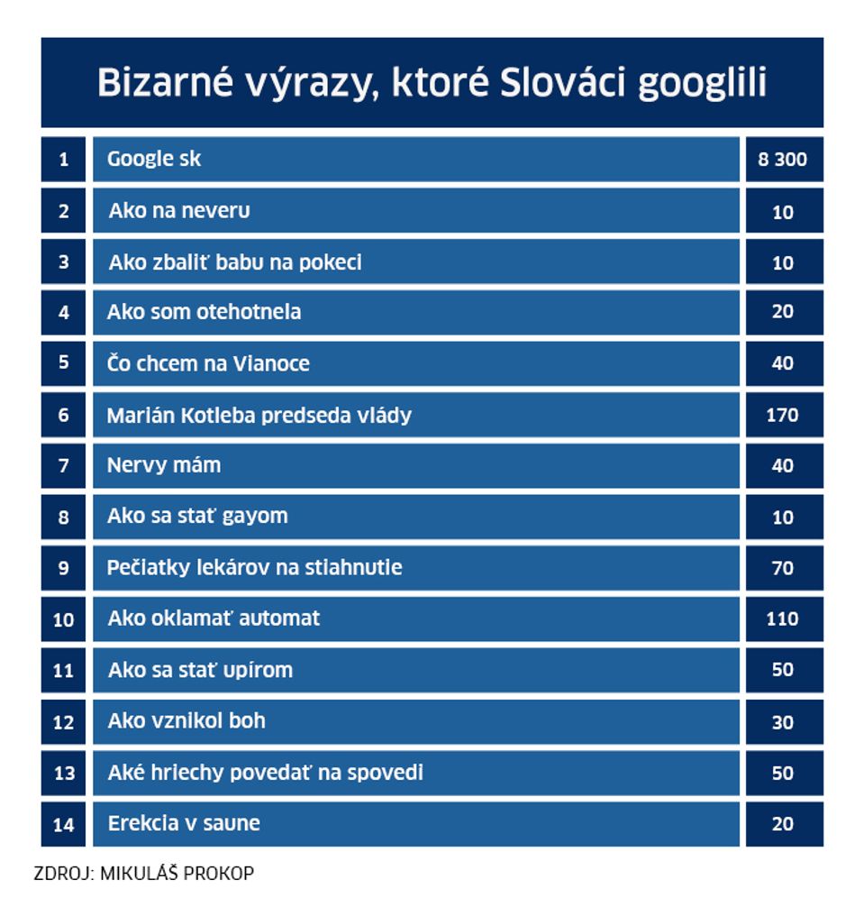Projektový manažér Mikuláš Prokop sa trocha pohral s Googlom a fantáziou Slovákov a pripravil rebríček najbizarnejších výrazov, ktoré sme v roku 2017 „gúglili“ na najpopulárnejšom vyhľadávači.
