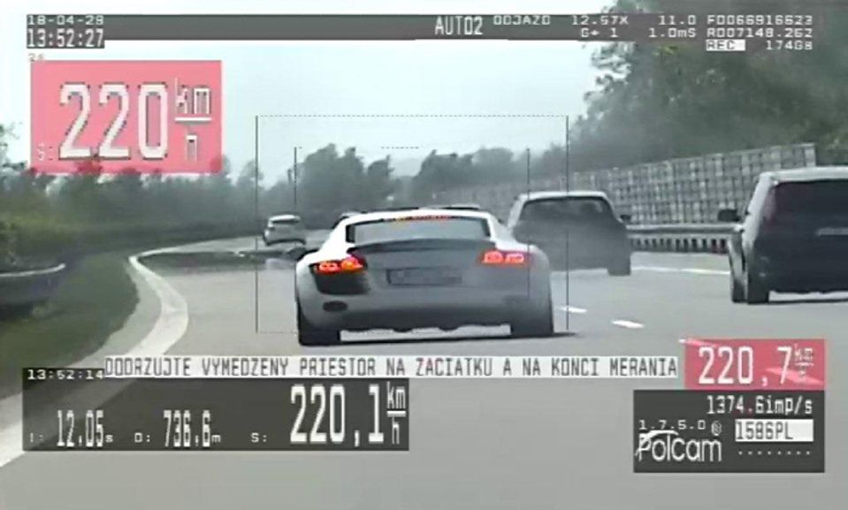Trenčianski diaľniční policajti zastavili v nedeľu (29.4.) popoludní na diaľnici D1 pri obci Ladce v Ilavskom okrese automobil Audi R8 jazdiaci rýchlosťou 220 kilometrov za hodinu.
