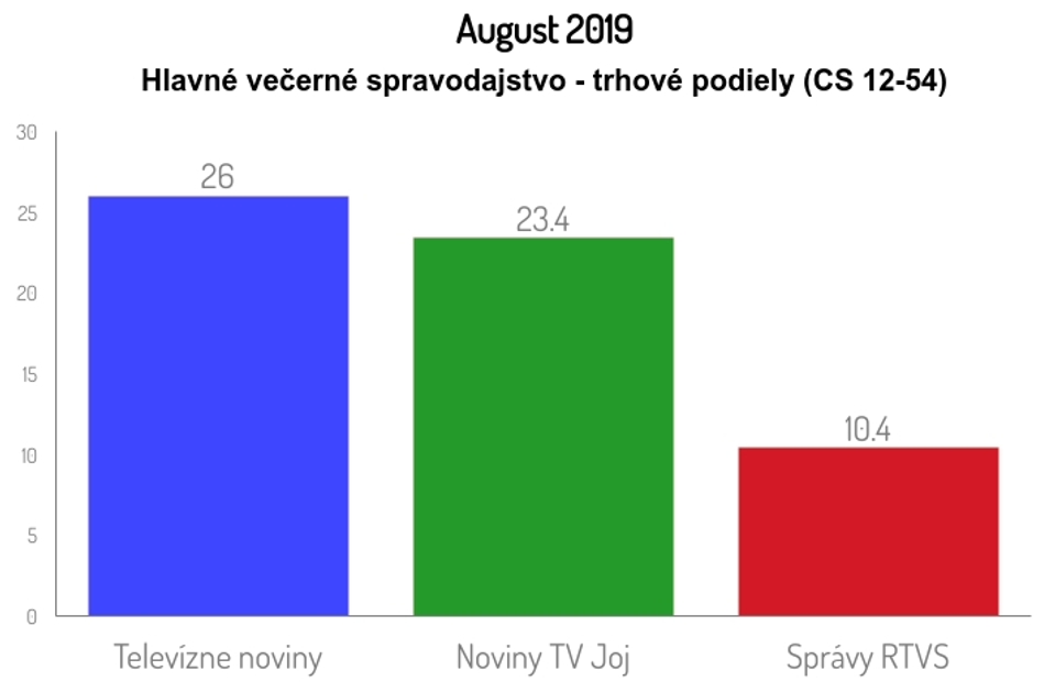 Výborné výsledky sledovanosti zaznamenala v auguste 2019 aj hlavná spravodajská relácia Televízne noviny. V obchodnej cieľovej skupine 12-54 dosiahla priemerný rating 5,6 % a trhový podiel 26,0 %.