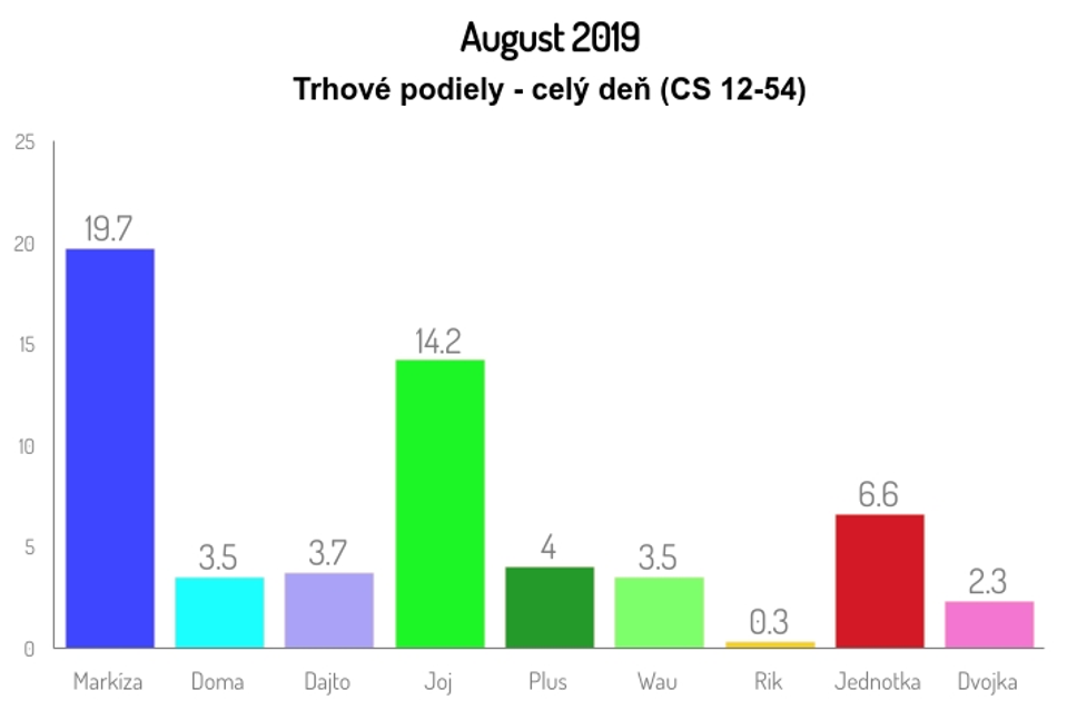 Taktiež aj samotná TV Markíza bola v auguste 2019 najsilnejšou spomedzi slovenských staníc, keď v cieľovej skupine 12-54 zaznamenala priemerný celodenný trhový podiel 19,7 %. Konkurenčná TV Joj (14,2 %) vykázala v rovnakom období o 5,5 percentného bodu slabší výsledok.