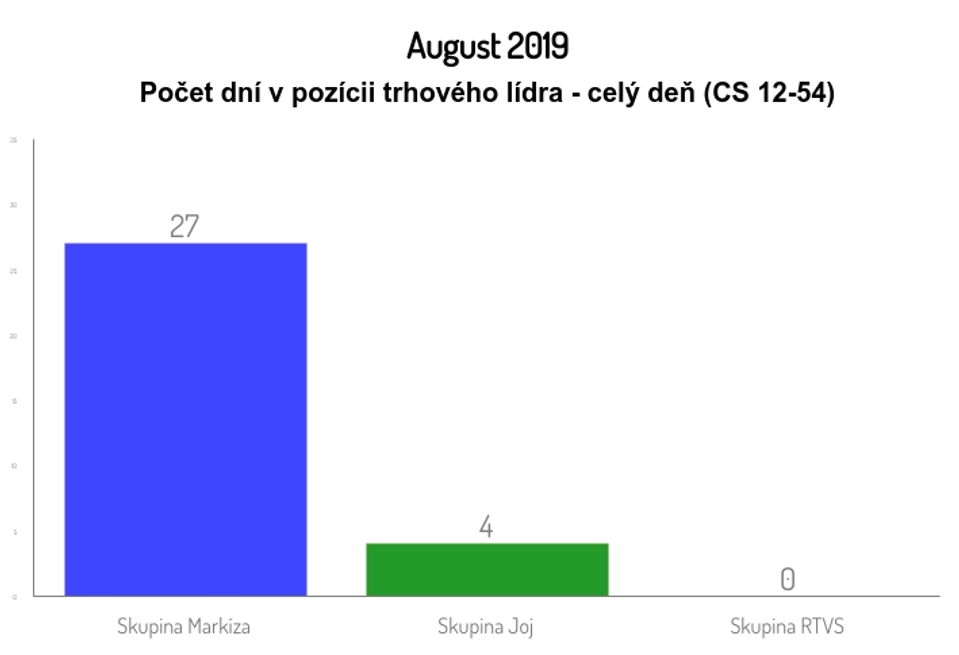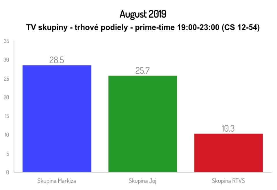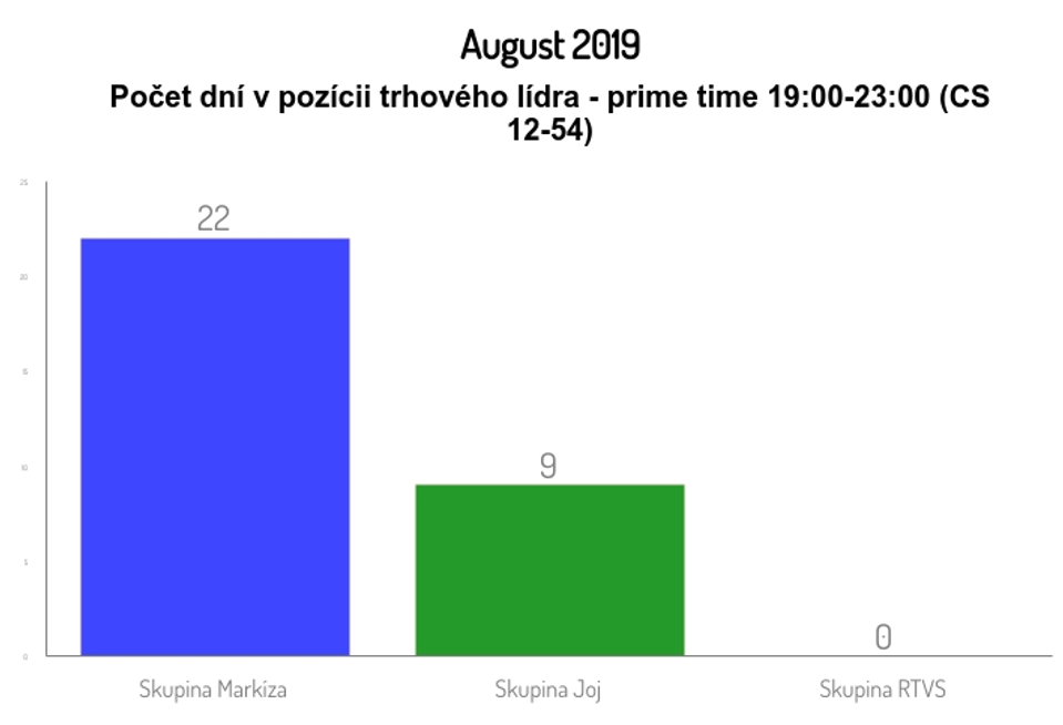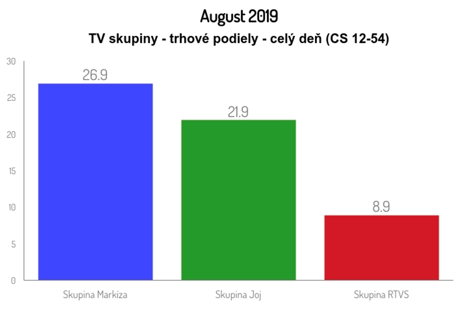 Skupina Markíza si so stanicami Markíza, Doma a Dajto aj v druhej polovici leta udržala stabilnú pozíciu jednoznačného lídra na slovenskom televíznom trhu. V uplynulom auguste 2019 dosiahla v obchodnej cieľovej skupine 12-54 priemerný celodenný trhový podiel 26,9 % a konkurenčnú skupinu Joj (21,9 %) tak predstihla s rozdielom 5,0 percentných bodov. Jednotkou na trhu bola skupina Markíza v 27 z 31 augustových dní.