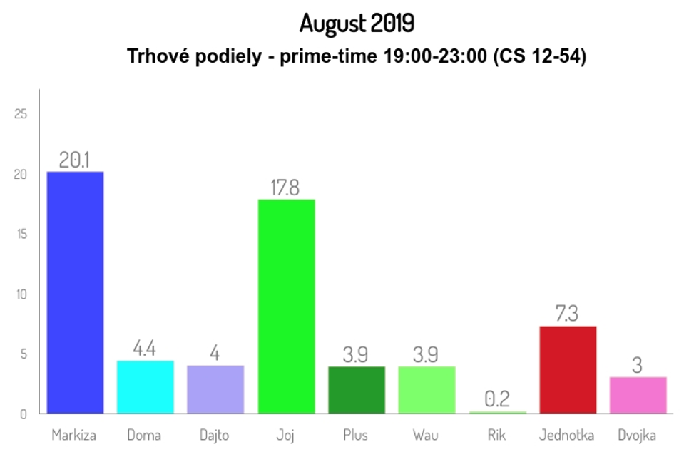 Samotná TV Markíza dosiahla v auguste 2019 v prime-time 19:00-23:00 priemerný trhový podiel 20,1 % a s rozdielom 2,3 percentného bodu tak porazila konkurenčnú TV Joj (17,8 %).