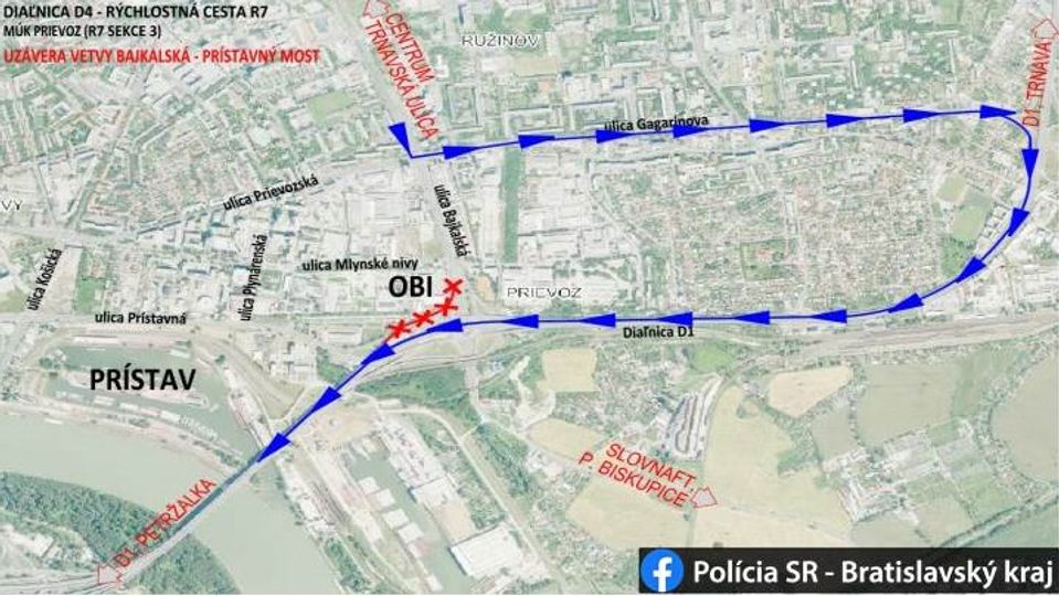 Polícia upozorňuje vodičov, že od nedele (16. 2.) od 20.00 h až do pondelka (24. 2.) d 04.00 h bude úplne uzavretá výjazdová vetva z Bajkalskej ulice na Prístavný most na diaľnica D1. V uvedenom úseku bude prebiehať rekonštrukcia pre potreby výstavby diaľnice D4 a rýchlostnej cesty R7.