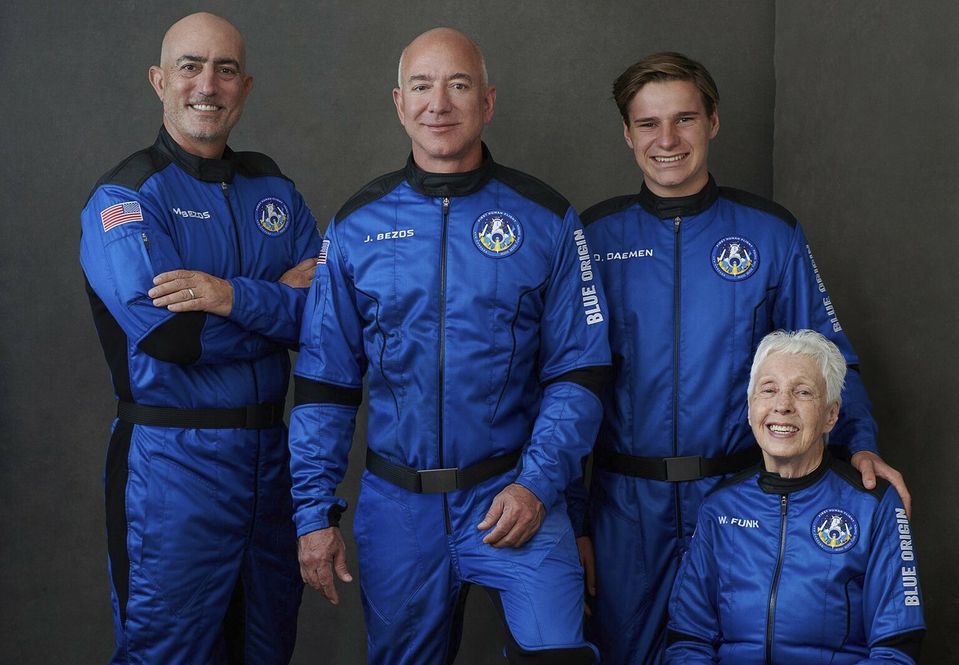 Do vesmíru s Daemenom a bratmi Bezosovcami letela aj 82-ročná americká letkyňa Wally Funková, ktorá sa stala najstarším človekom vo vesmíre. Rekord držal astronaut John Glenn, ktorý v roku 1962 ako prvý Američan obletel zemeguľu a do vesmíru sa opäť pozrel v roku 1998 ako 77-ročný.