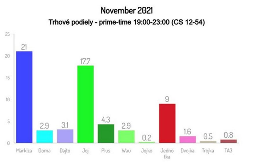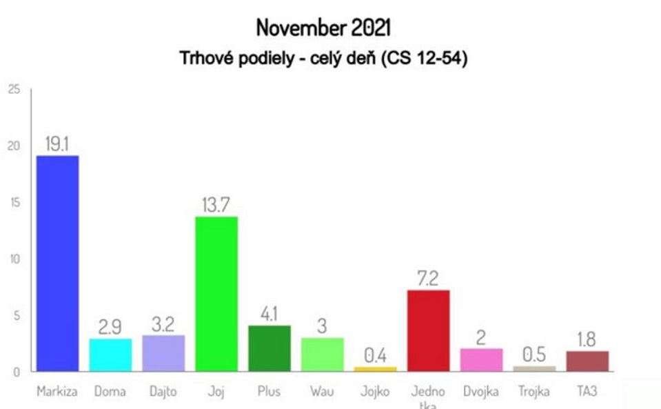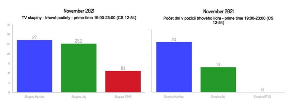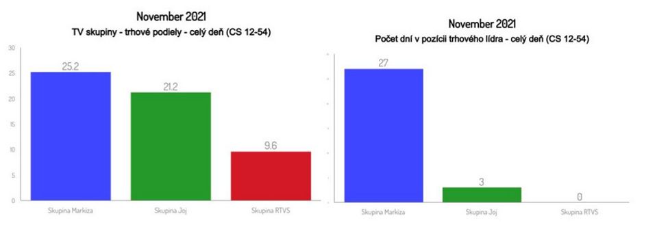 Skupina Markíza bola v novembri 2021 jednotkou na trhu aj v prípade divákov starších ako 12 rokov s priemerným celodenným trhovým podielom 23,0 % a odstupom 2,6 percentuálneho bodu od konkurenčnej skupiny Joj (20,4 %). Trhovým lídrom bola v 27 z 30 dní uplynulého mesiaca. Prvenstvo jej patrilo taktiež v prime-time 19:00-23:00 s dosiahnutým priemerným podielom na trhu 26,0 % a náskokom 1,2 percentuálneho bodu pred skupinou Joj (24,8 %), ktorú porazila v 18 z 30 novembrových dní.