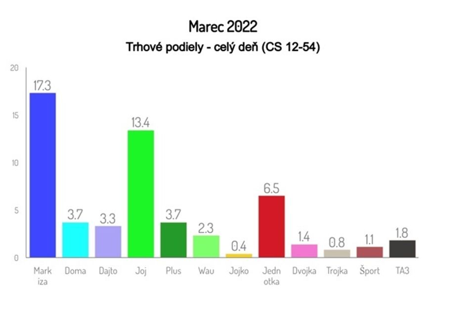 Taktiež aj samotná TV Markíza bola v marci 2022 suverénne najsilnejšou spomedzi slovenských staníc, keď v cieľovej skupine 12-54 zaznamenala priemerný celodenný trhový podiel 17,3 %. Konkurenčná TV Joj (13,4 %) vykázala v rovnakom období rovnako o 3,9 percentuálneho bodu slabší výsledok.