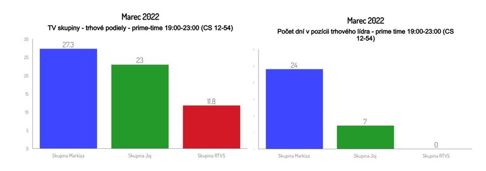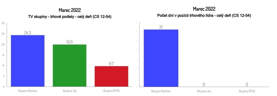 Skupina Markíza si so stanicami Markíza, Doma a Dajto v uplynulom marci 2022 udržala a medzimesačne ešte viac posilnila stabilnú pozíciu jednoznačného lídra na slovenskom televíznom trhu. V obchodne podstatnej cieľovej skupine 12-54 dosiahla priemerný celodenný trhový podiel 24,3 % a konkurenčnú skupinu Joj (19,9 %) tak predstihla s rozdielom 4,4 percentuálneho bodu. Zároveň si v porovnaní s februárom 2022 polepšila o 0,8 percentuálneho bodu. Jednotkou na trhu bola skupina Markíza v každý jeden z 31 marcových dní.