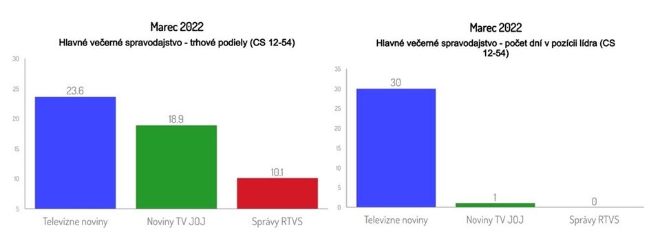 Televízne noviny zaznamenali v uplynulom marci 2022 priemerný rating 8,1 % a trhový podiel 23,6 %. Sumár spravodajských aktualít sledovalo na obrazovkách trhového lídra v priemere 487-tisíc divákov starších ako 12 rokov.