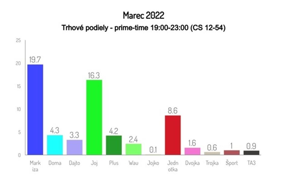 Samotná TV Markíza dosiahla v marci 2022 v prime-time 19:00-23:00 priemerný trhový podiel 19,7 % a s rozdielom 3,4 percentuálneho bodu tak porazila konkurenčnú TV Joj (16,3 %).