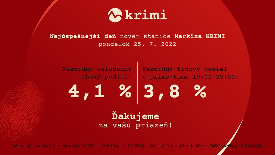 Prekonáva jeden rekord za druhým a je čoraz úspešnejšia. Najmladšia slovenská televízia Markíza KRIMI si hneď od svojho štartu 6. júna 2022 získala silnú divácku základňu a dosahuje excelentné výsledky sledovanosti. V pondelok 25. júla 2022 bola dokonca piatou najsilnejšou stanicou na trhu, pričom zaznamenala rekordné trhové podiely a odvysielala aj svoj doposiaľ najsledovanejší program.