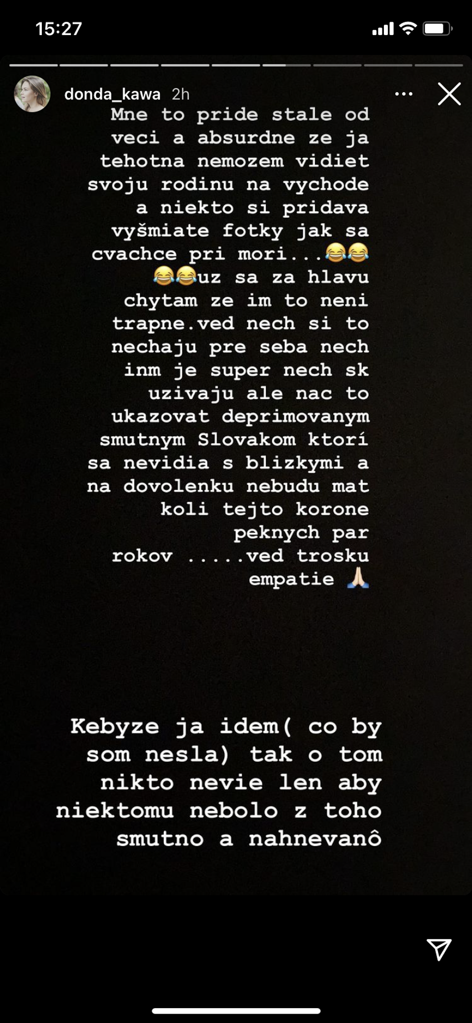 „Príde mi odveci a absurdné, že ja, tehotná, nemôžem vidieť svoju rodinu na východe a niekto si pridáva vysmiate fotky ako sa čvachce pri mori. Už sa chytám za hlavu, že im to nie je trápne. Veď nech si to nechajú pre seba, nech im je super, nech si užívajú, ale načo to ukazovať deprimovaným smutným Slovákom, ktorí sa nevidia s blízkymi a na dovolenku nebude mať pre koronavírus pekných pár rokov. Veď trošku empatie! Ak by som ja išla (čo by som teda nešla), tak o tom nevie nikto, len aby niekomu nebolo smutno a nebol nahnevaný,“ zverejnila herečka v príbehu na svojom instagramovom profile.