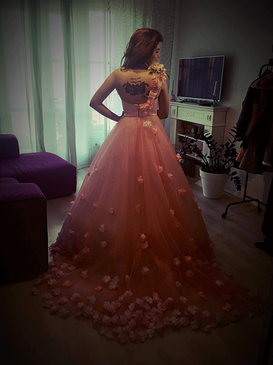 Chcela, aby vyzneli jej tetovania, ale chcela pôsobiť romanticky. Na jej plesovú róbu využili viac ako 450 kvetov, ktoré ručne prišívali na šaty.