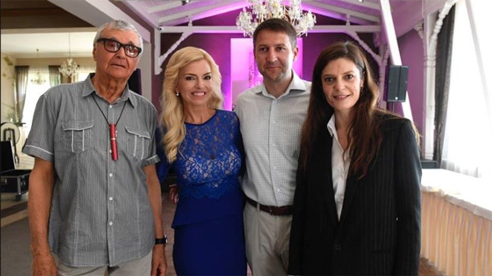 Zlatica Puškárová po boku otca Medzinárodného filmového festivalu Trenčianske Teplice Petra Hledíka (vľavo), primátora Trenčianskych Teplíc Štefana Škultétyho a herečky Chiary Mastroianni.