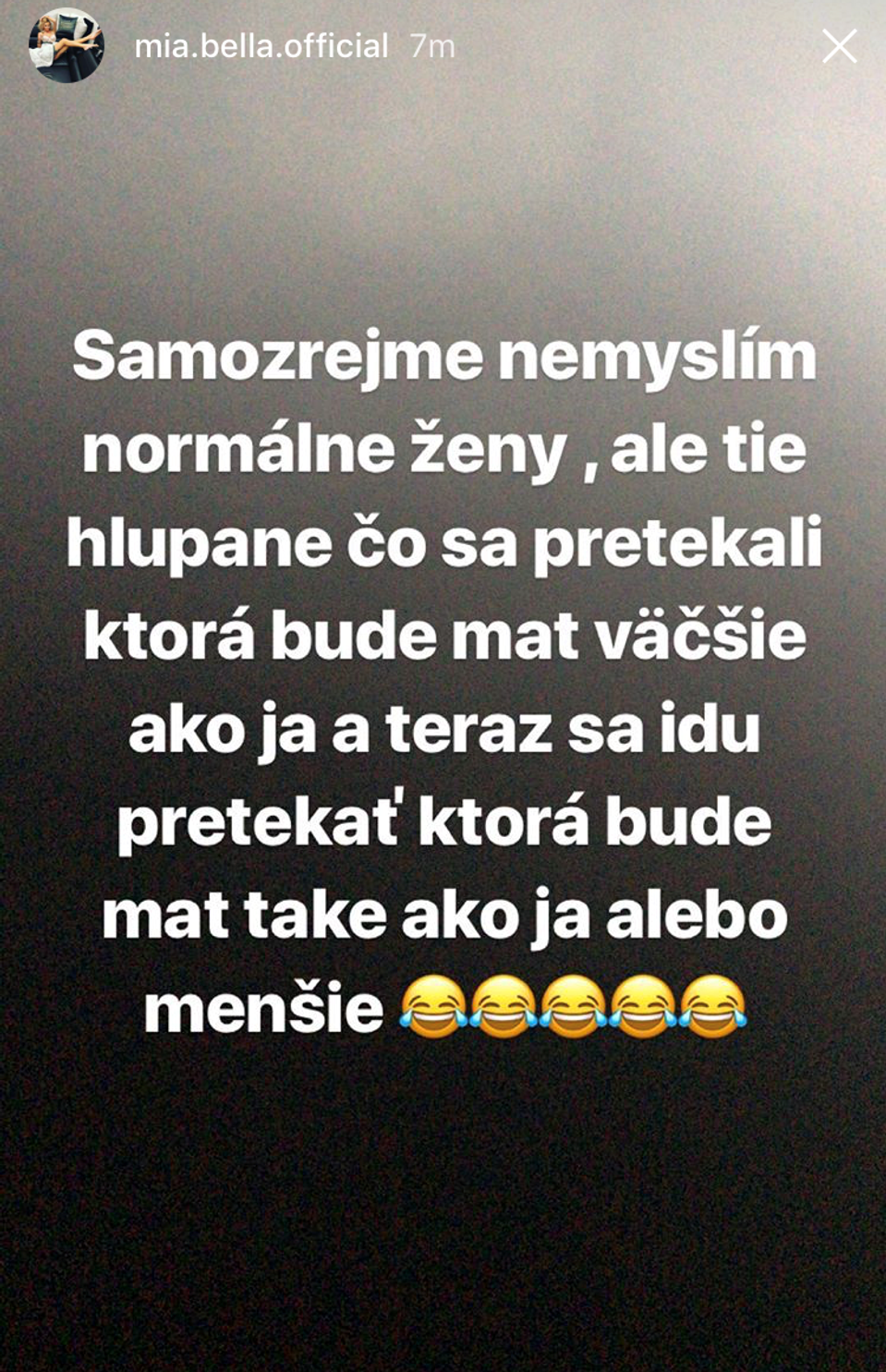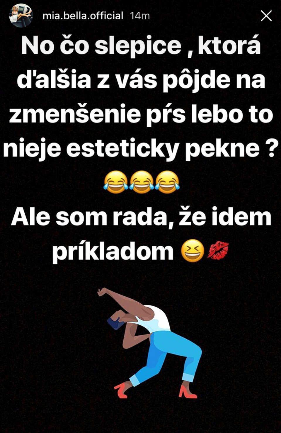 Z tohto bude zrejme ďalšia slovná prestrelka na Instagrame. Po tom, čo sa Zuzana Strausz Plačková priznala, že si plánuje nechať zmenšiť prsia, zverejnila Mia Bella (Michaela Gašparovičová) vyjadrenia, v ktorých si servítku pred ústa nedávala.
