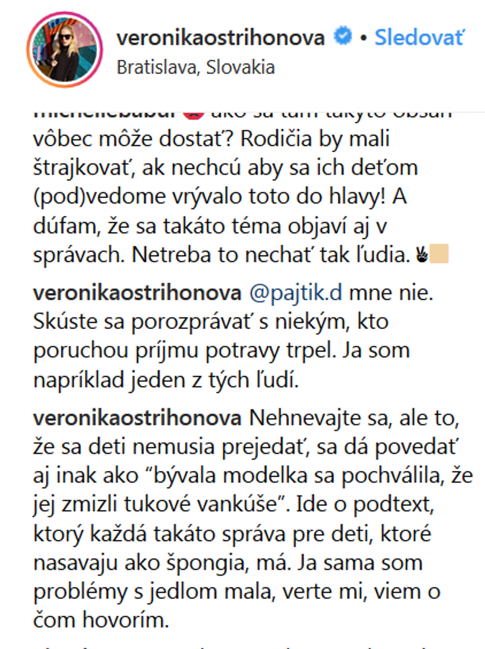 „Mne nie, skúste sa porozprávať s niekým, kto poruchou príjmu potravy trpel. Ja som napríklad jeden z tých ľudí,“ priznala tak problémy, o ktorých doteraz vedel zrejme len málokto.