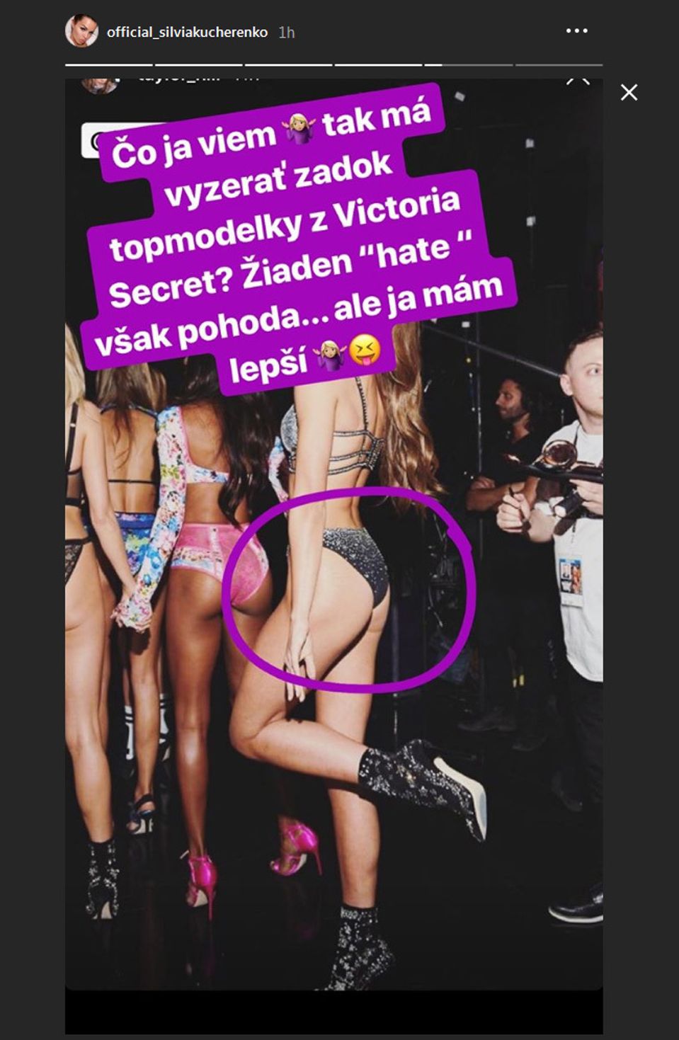 Na Instagrame napísala: "Čo ja viem. Tak má vyzerať zadok topmodelky z Victoria Secret? Žiaden "hate", však pohoda...ale ja mám lepší."