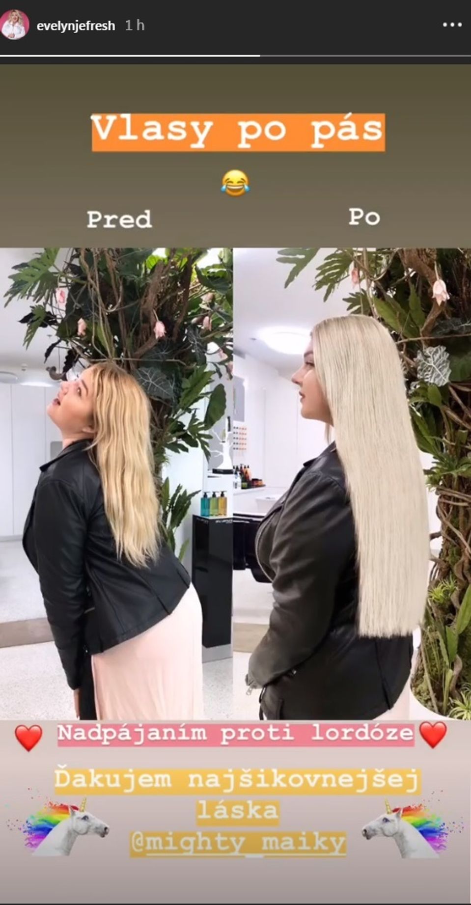 Evelyn sa rozhodla navštíviť kadernícky salón a svoje blond vlasy si nechala predĺžiť až po pás. K fotografii pred a po pridala aj vtipný komentár. "Nadpájaním proti lordóze."
