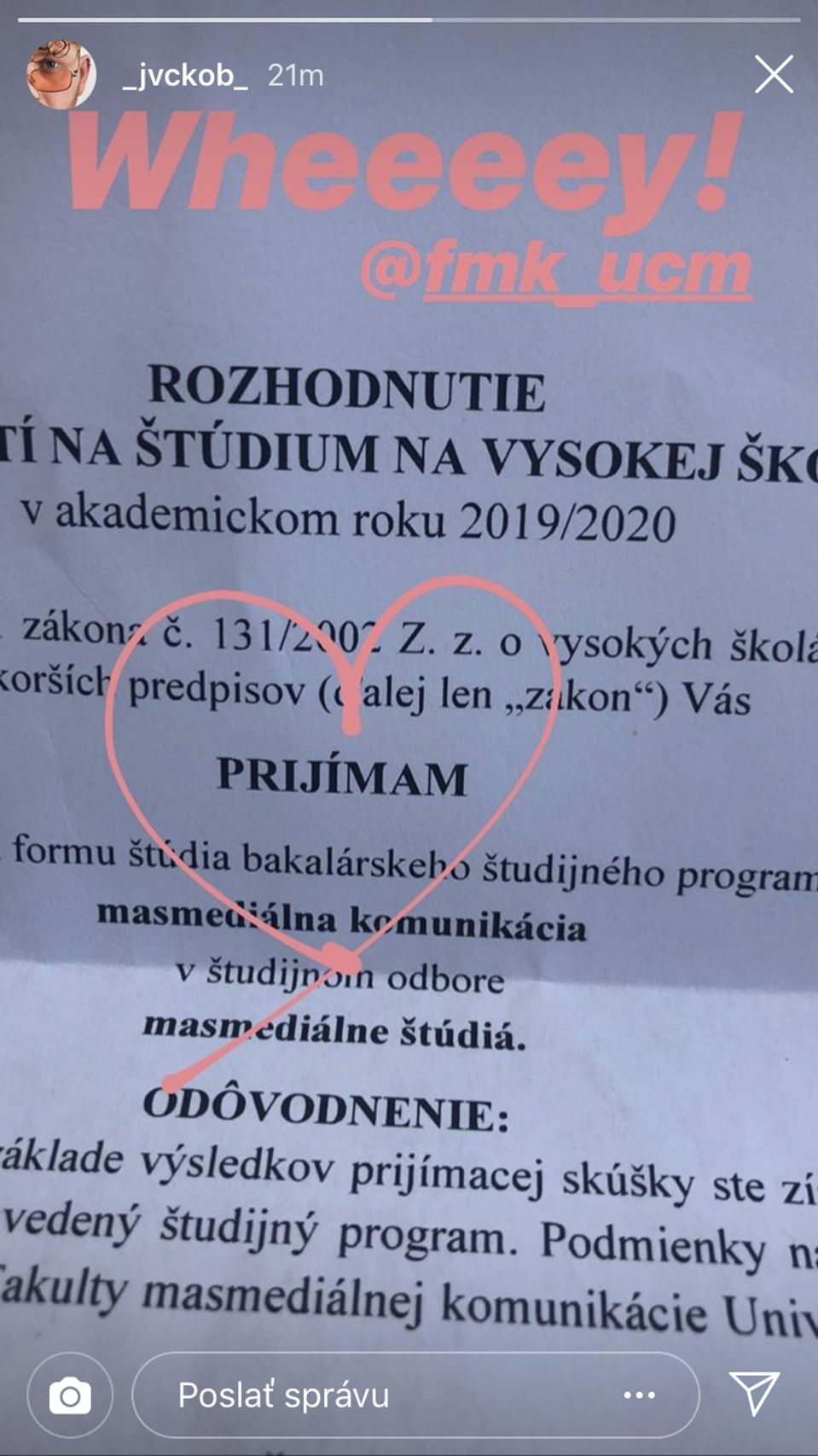 Jakub sa na Instagrame pochválil skvelou správou - prijali ho na vysokú školu. Od septembra tak zasadne do lavíc a bude študentom masmediálnej komunikácie v Trnave.