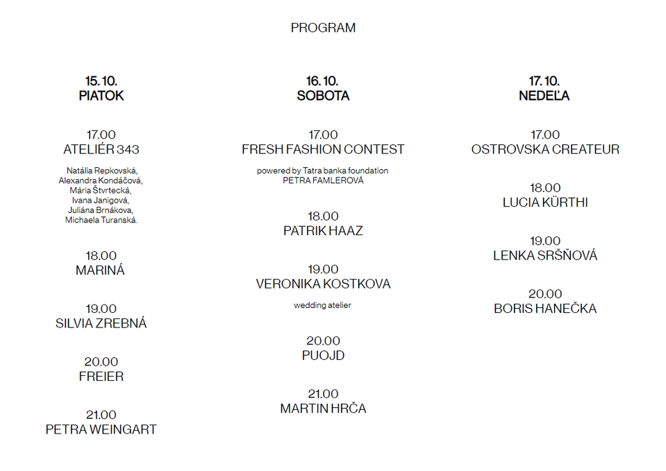 Milovníkov módy bude určite zaujímať program podujatia – začína sa každý deň o 17.00 h a ponúkne niekoľko módnych prehliadok denne. V piatok predstavia v uvedenom poradí svoje kolekcie Ateliér 343, značka Mariná, Silvia Zrebná, freier a Petra Weingart.