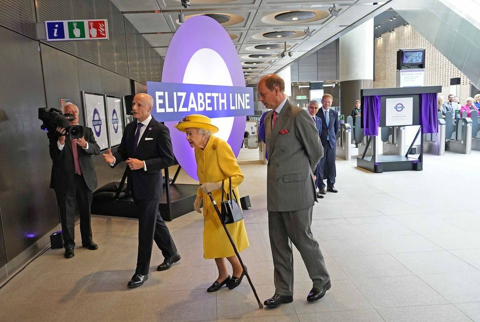 Kráľovná, ktorá sa podopierala o vychádzkovú palicu, si zobrala limitovanú edíciu cestovnej karty Elizabeth Line Oyster a pracovníci jej pomohli ju dobiť v automate sumou päť libier.