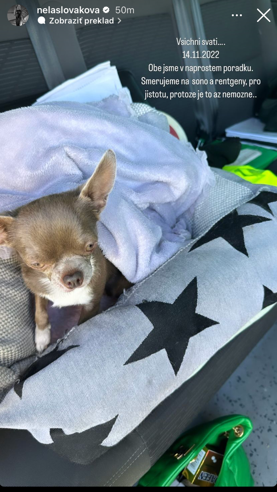 Tá zverejnila na Instagrame fotku jej milovaného psíka, Lottynky, so slovami, že sú obe v poriadku: „Všetci svätí... 14. 11. 2022. Obe sme v úplnom poriadku. Smerujeme na sono a röntgeny, pre istotu, pretože je to až nemožné.“