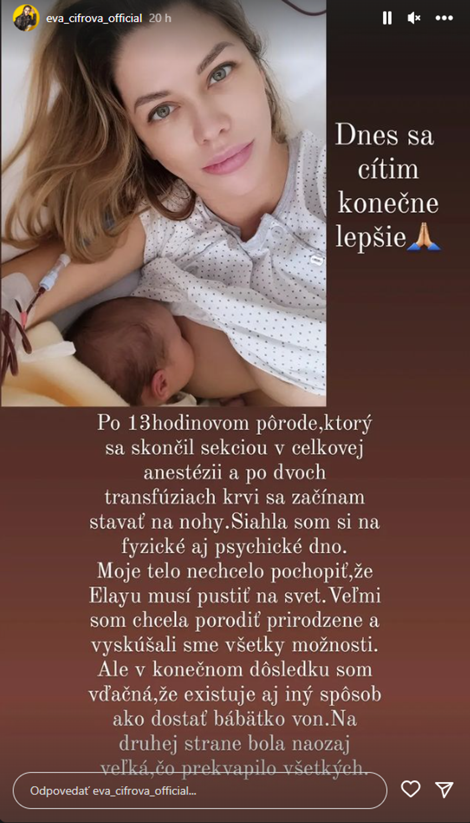 Ako čerstvá mamina napísala na Instagrame, pri pôrode si siahla na dno, dostala dve transfúzie a po 13 hodinách musela podstúpiť sekciu v celkovej anestézii. Teraz sa už cíti lepšie a stará sa o svoj najväčší poklad.