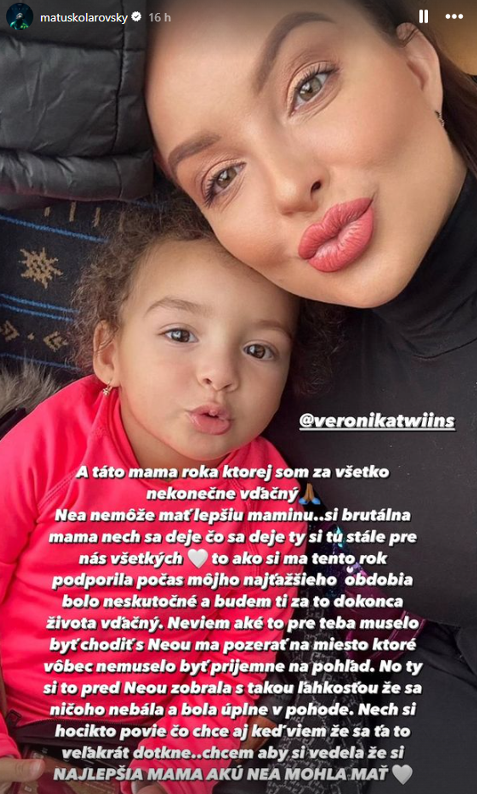 Vo vyznaní bol veľmi osobný a úprimný. „Mama roka, ktorej som za všetko nekonečne vďačný. Nea nemôže mať lepšiu maminu, si brutálna, nech sa deje, čo sa deje, si tu stále pre nás všetkých,“ napísal s tým, že ho Veronika podporila v jeho najťažšom období a bude jej za to vďačný do konca života.
